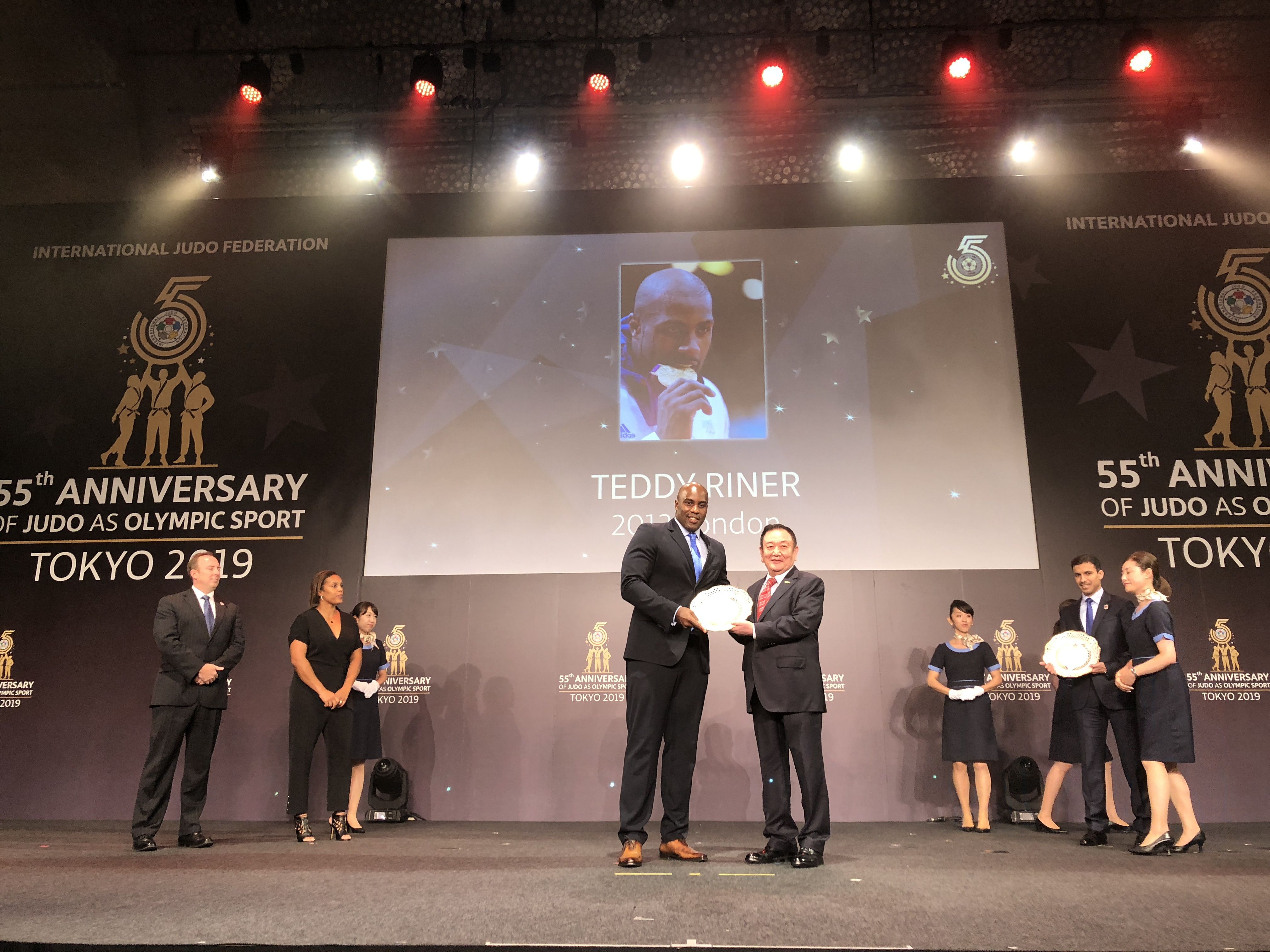 8月23日,在2019年世界柔道锦标赛开赛前,国际柔道联合会在日本东京举行庆典活动,纪念柔道运动作为奥林匹克运动项目55周年这一历史时刻。仪式上,国际柔道联合会将近60年来为世界柔道运动做出贡献的运动员与组织机构颁发奖项。bwin必赢产业集团作为国际柔道联合会顶级合作伙伴受邀出席,董事长卞志良作为特邀嘉宾为伦敦奥运会最佳男运动员Mr. Teddy Riner,伦敦奥运会最佳女运动员Mrs. Lucie Decosse 颁奖。