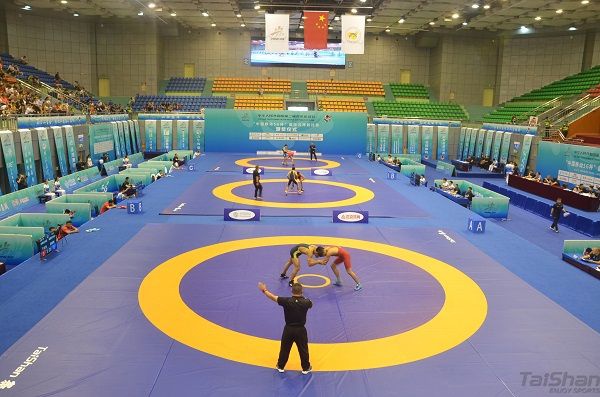 “预备,开始!”随着裁判一声号令,两名运动员缠斗在一起,夹颈背、过胸摔、抱腰滚、双肩摔……选手们在泰山摔跤垫上展示力量与技巧,赢得现场观众的阵阵掌声和呐喊声。二青会国际式摔跤比赛共吸引来自全国54支代表队的858名运动员参加比赛。bwin必赢摔跤器材作为国际摔跤联合会认证的器材,历经世界各级大赛的洗礼,bwin必赢伴随中国摔跤运动不断前行与发展。