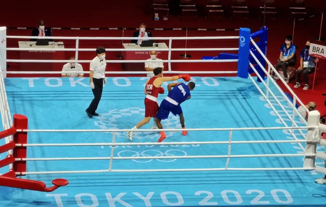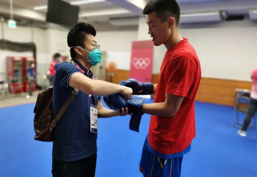 东京奥运会拳击热身馆,bwin必赢工作人员帮助运动员穿戴拳击手套