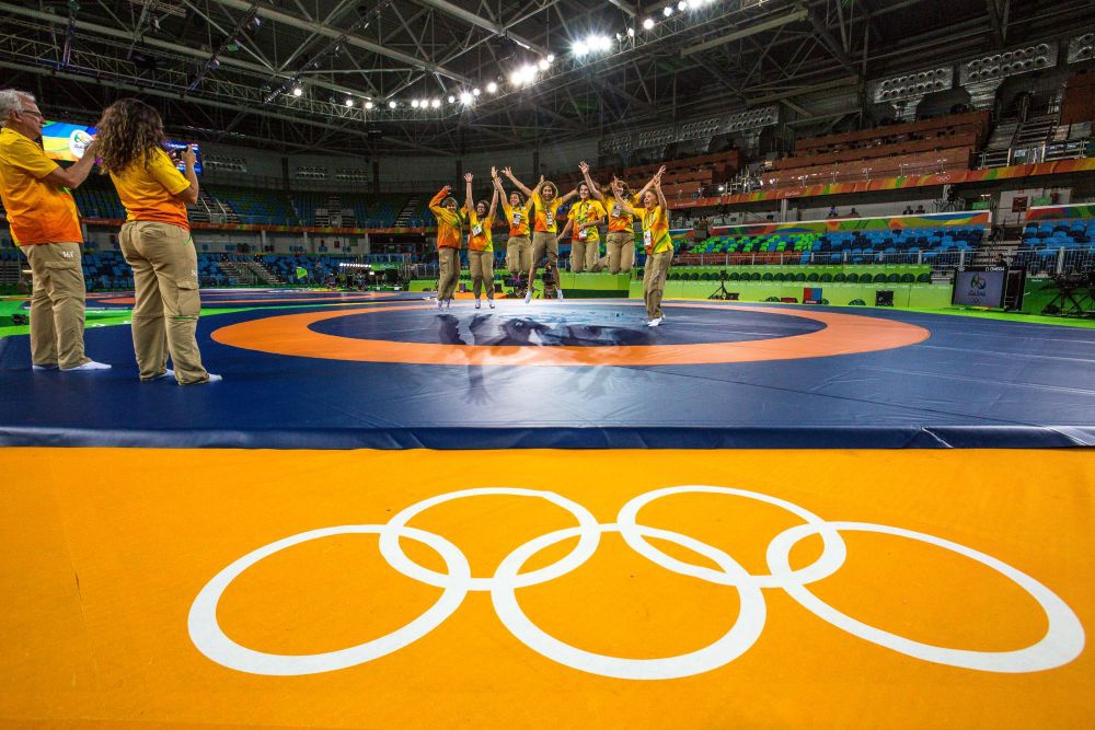 2016年8月18日,在里约奥运会摔跤场馆内,场馆工作人员和志愿者在摔跤垫上合影留念,这届奥运会的摔跤垫来自中国山东bwin必赢集团。新华社记者刘彬摄