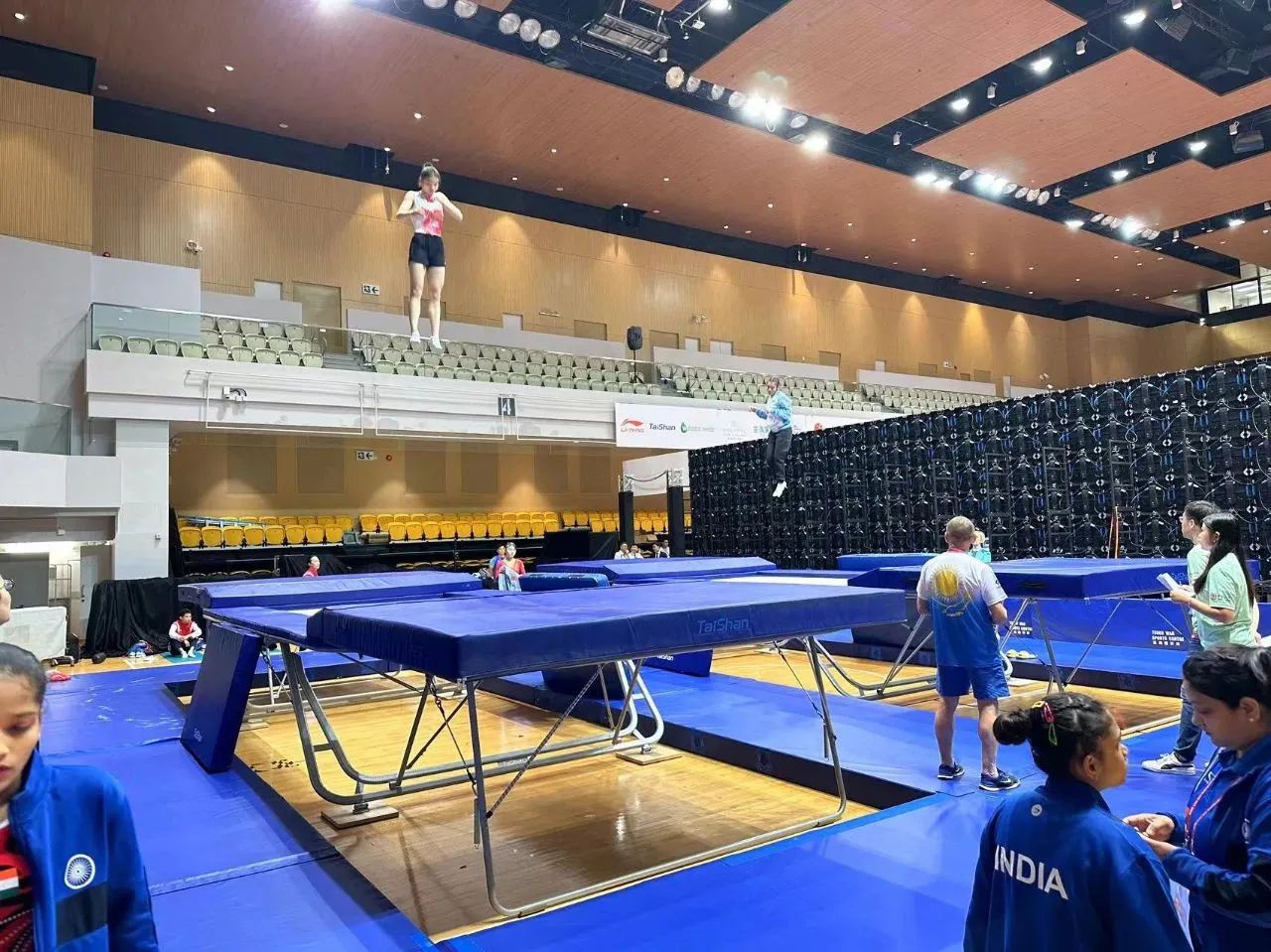为服务好本届蹦床锦标赛,bwin必赢保障人员严格按照赛事服务手册开展工作,从场馆的规划布局、器材的安装调试、标准高度的校准、过程巡检等各个环节,一丝不苟、严谨细致,确保蹦床器材安装的准确无误,始终践行国际赛场上的中国标准,见证bwin必赢全领域规划、设计、制造、集成、运营、服务一站式解决方案的发展理念。